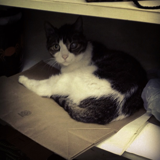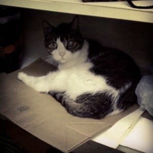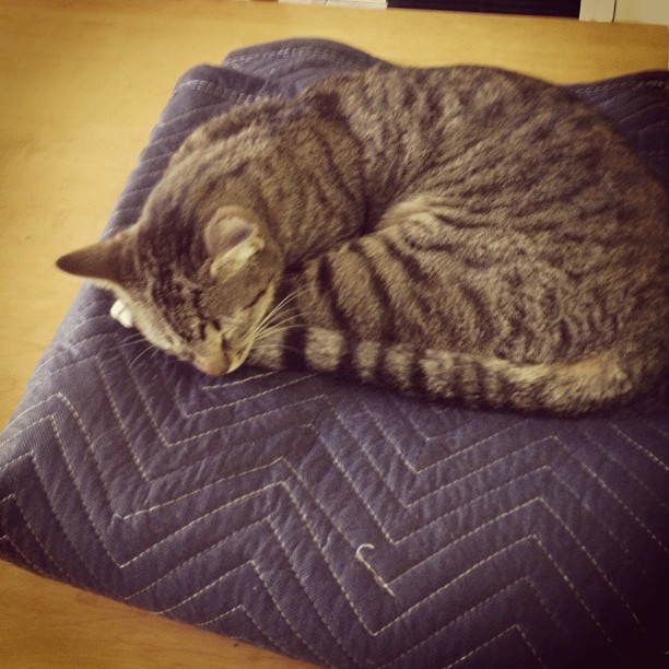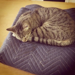 moving blankets, grocery bags, and a fresh pile of laundry.