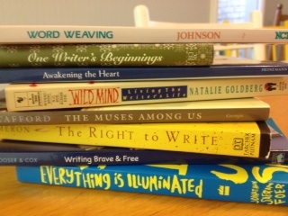 Creating my own book spine poem, I stacked some of my books about writing. We writers collect books that give us advice. Some of my books are about my own personal writing, some for teaching writing. I sculpted the stack to try to make the titles work together, but I still wanted to insert text. Reminds me of working with paste pot poetry or magnetic poetry.