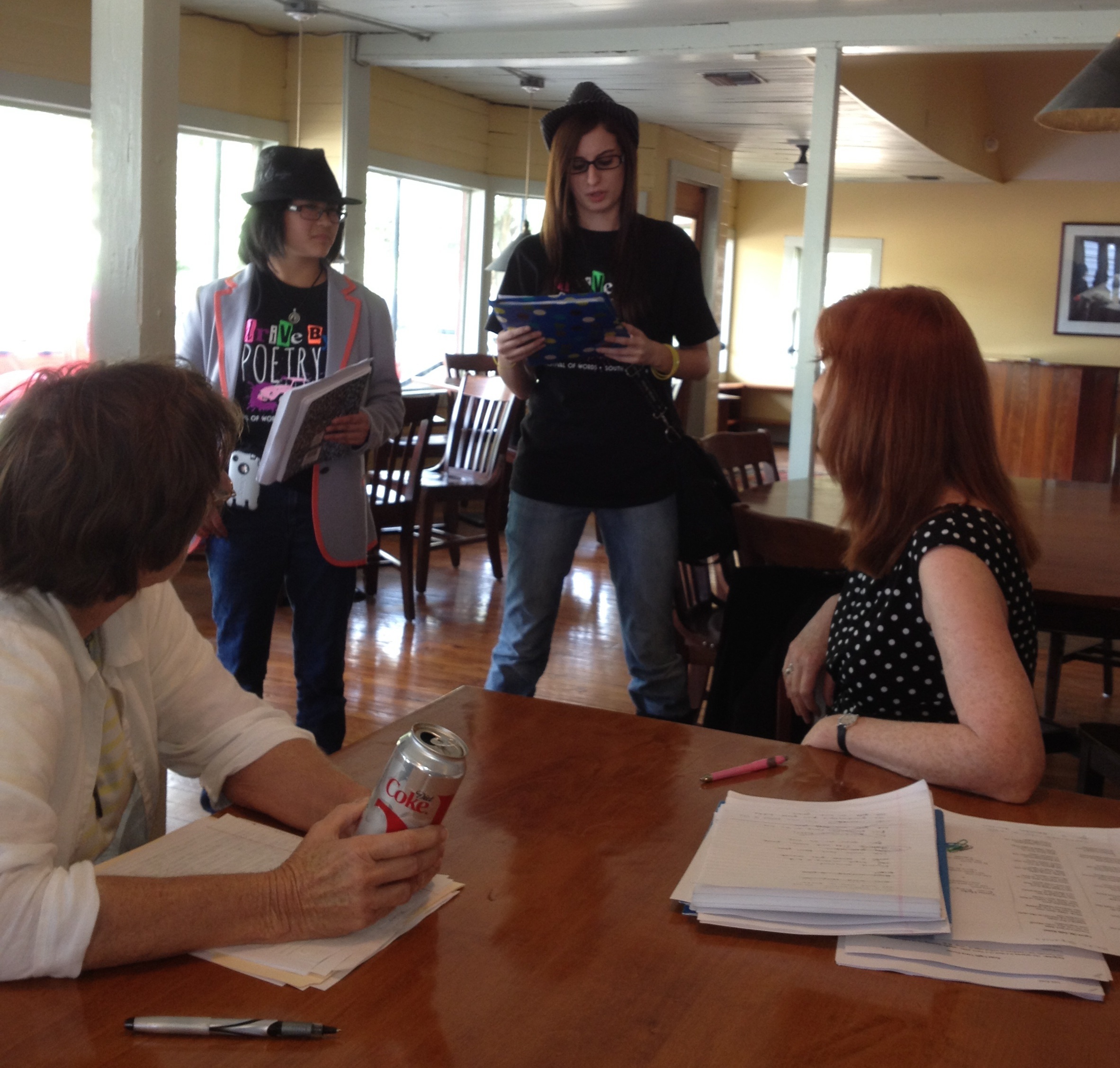The Festival of Words began with an awards ceremony on Thursday evening for the winners of the writing contest. I was privileged to have a student winner, so I picked her up after school, and we drove the hour to the Sunset library, just west of Grand Coteau. She commented that she loved the name of the town “Sunset.” At the awards ceremony, I introduced my student to two state poets laureate, Darrell Bourque and Julie Kane.