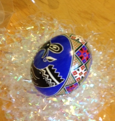 *After the wordlab, I attended Art Walk and met a Slavic woman who had a show of her Pysanky eggs. Her husband was demonstrating the process using a stylus called a kistka. I had to add that to my poem. Pysanky is the ancient Eastern European art of egg decorating. The name comes from the verb to write, as you use a stylus (called a kistka) to write with wax on the egg shell. The process is similar to batik.