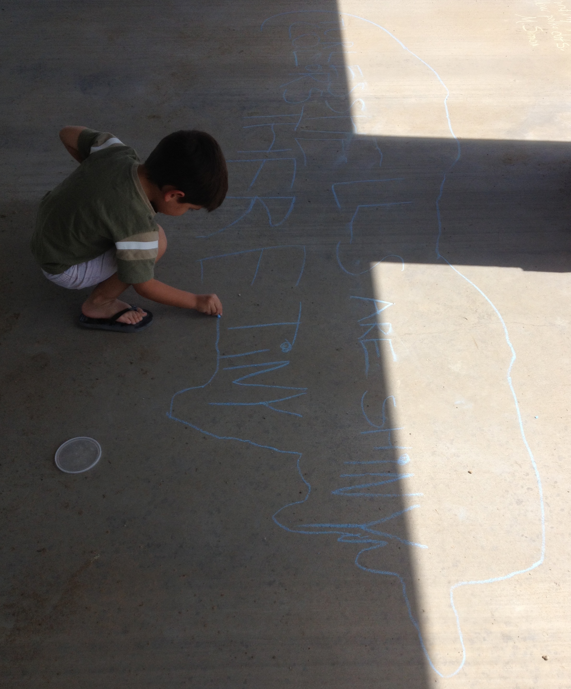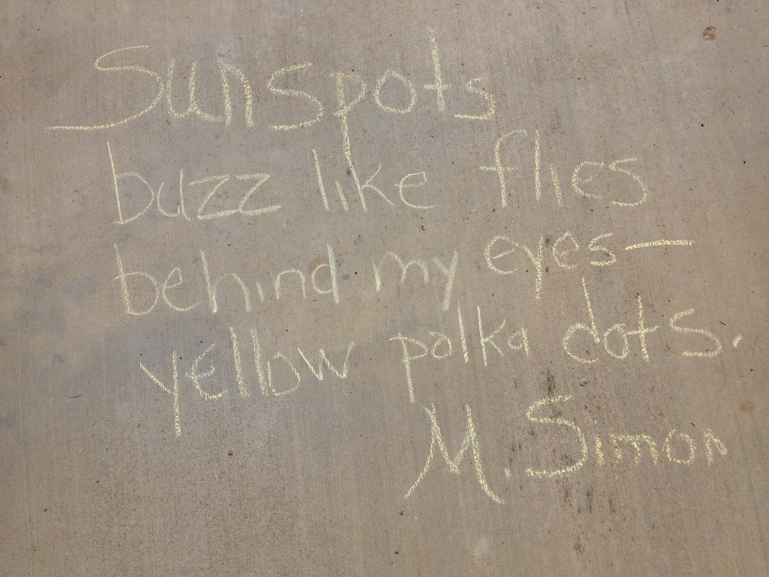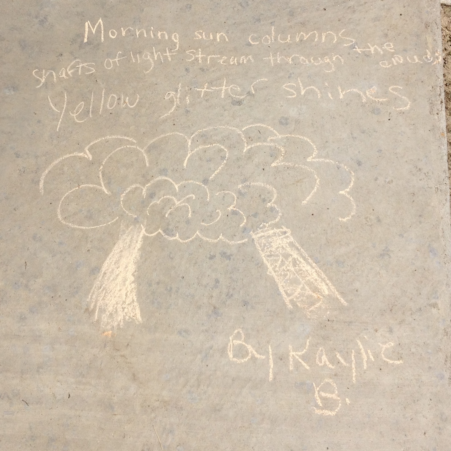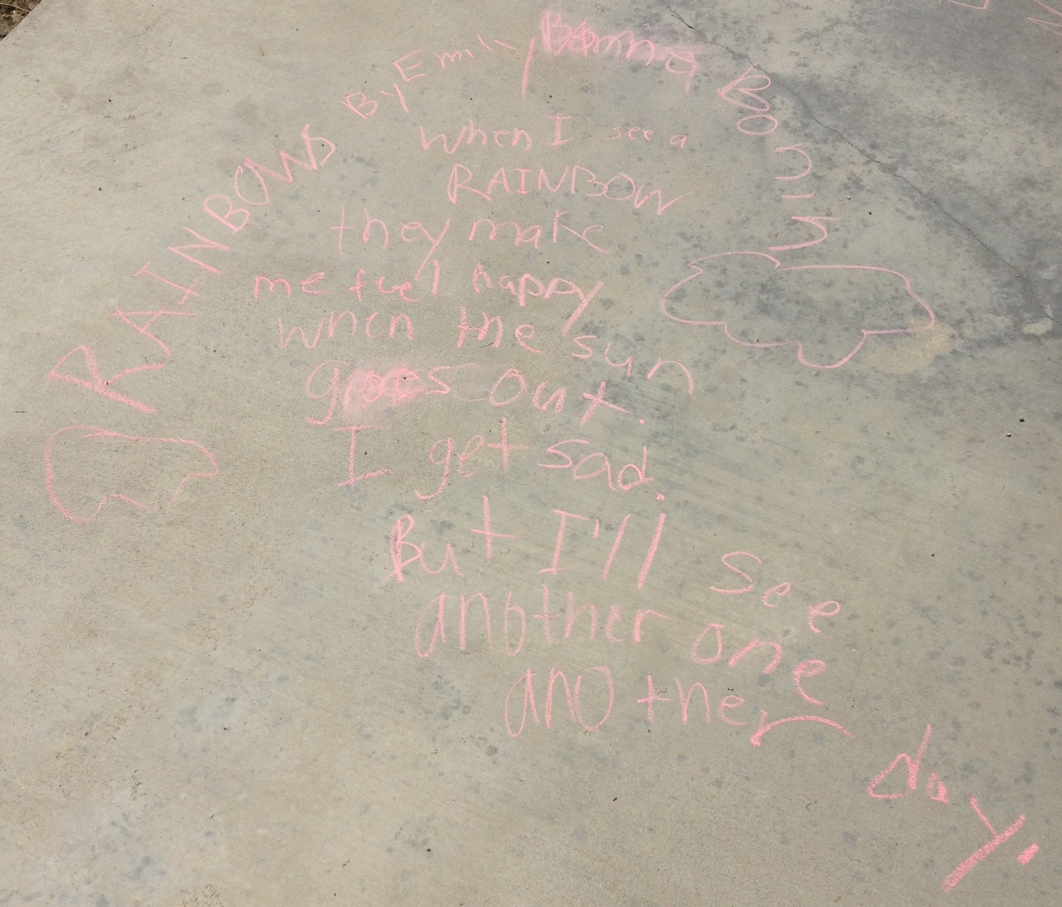While Kaylie and I were helping Jacob write his poem, Emily was writing. She wrote another poem. This one about rainbows. I love waving the magic wand of poetry over children. The world is a better place and certainly more fun! Thanks, Erica, for loaning me your delightful children for this summer Chalkabration.