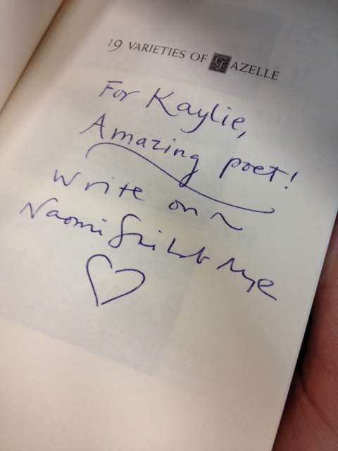 These are the first words I wrote in my journal in the Festival of Words poetry workshop with Naomi Shihab Nye on Saturday. I was star-struck… for about 5 minutes. Because Naomi is probably one of the warmest, most welcoming, poetry presenters I have ever seen. She makes everyone feel like they belong there. Even the man who had to step out to take a phone call. She spoke to him with concern and said, “Step out any time you need to. I understand.” And the woman who attended without registering. She pulled up a chair right next to her. “You are no intruder. You are a poet.”