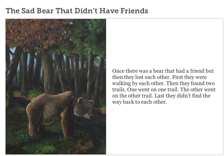 Andrew found a palate of images that he liked, and immediately wrote the title, The Sad Bear that Didn’t Have Friends. The pictures led him to write a story about a bear and his friend, a girl named Gina, who were separated in the woods. The bear found new friends, but Gina only found a tree shaped like a peacock. The images led Andrew to write more and add a little humor as well. Using Storybird, I was able to show him some basic editing, such as adding punctuation and capital letters. He also wrote using and over and over. I read his long sentence without taking a breath to show him that the reader needs a period or a comma, so she can breathe. I think we both enjoyed this process. Andrew was proud to read his story aloud to his classmates using the smart board.