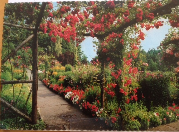 Once again the postcards Laura Shovan sent me, along with Pantone colors, inspire my writing. This postcard shows the Rose Garden at Butchart Gardens in Victoria, B.C., Canada. The postcard states that the gardens were once an abandoned quarry. A quick Google search found that they are still blooming today, “over 100 years in bloom.”
