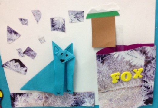 Here is Erin’s. She put her origami fox in a snow scene and made the poem appear in a flip-open book.