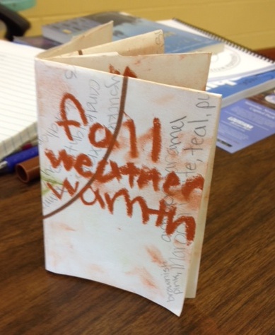 Select six concrete words from your writing. Then write a six-lined poem. The poems were as varied as the students themselves. I enjoyed hearing how the free writing influenced the final poem. I think they were richer somehow. We then created a folded book from the art paper and wrote the six lines on the six pages of the book.