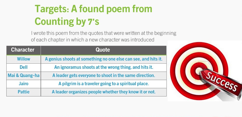 Vannisa used chapter quotes from Counting by 7’s. Each phrase connects to the character in some way.