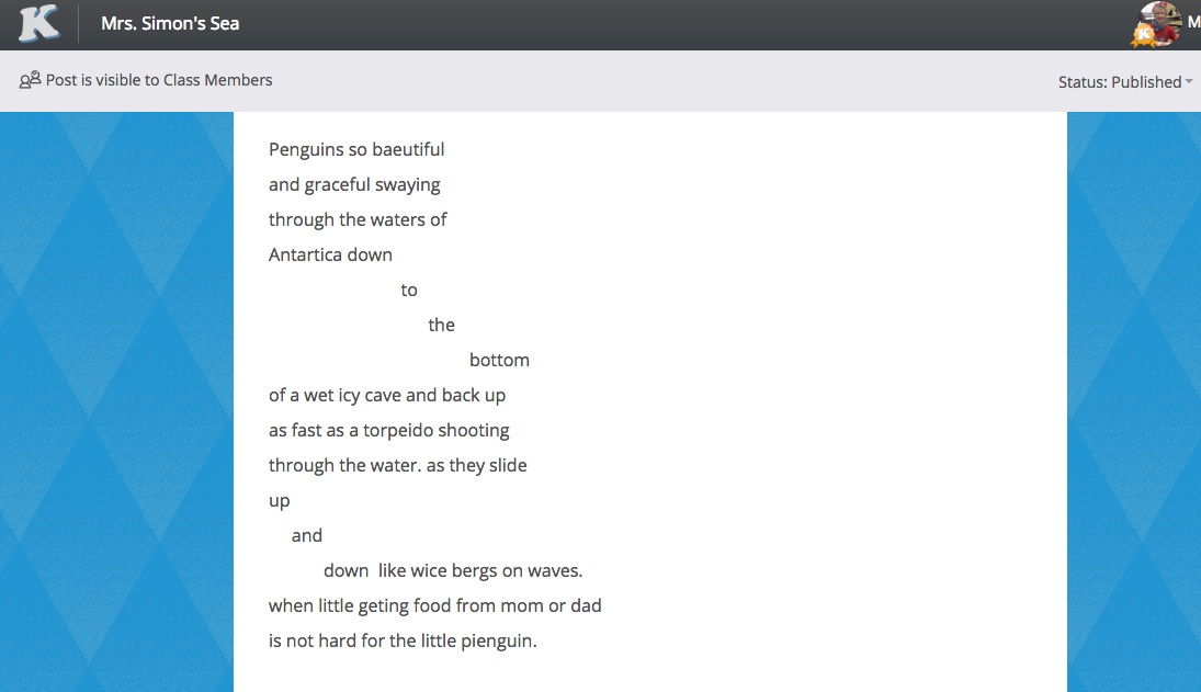When we teach digital literacies, we need to take time to notice the treasure in the details. Even our youngest students can use these tools to express themselves effectively. Take a look at another of Madison’s recent creations. We were learning about Antarctica and poetry with Irene Latham’s book When the Sun Shines on Antarctica. Madison is in second grade, and this year is her first year in my class. She has jumped right into digital literacies and blogging. I love this poem she wrote about penguins. She used the craft move from Irene’s poetry to show the movement of the penguin diving into the sea. I didn’t watch her do this, but I am sure it took quite a bit of patience tabbing over and placing the words just right. What a treasure in that little detail! (Click on the image to see a larger view.)