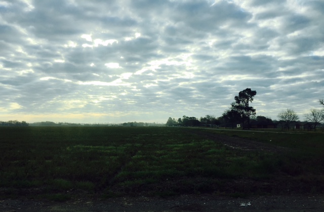 The sun is a bright yellow-white light shining through a bluish-grey sea of clouds. Beams of light reach from the sun to the ground below, spotlighting the golden fields fallow now in winter. The clouds are white-capped waves dancing on the surface of the sea.
