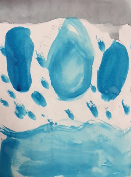 Earlier in the week we danced with paintbrushes, making watercolor abstract paintings while listening to music. One selection led some of us artist/poets to think of water (rain). It’s been raining every morning for the last few days. I wrote a more playful poem while my 5th grader, Tobie, is thinking deeply and writing serious poems.