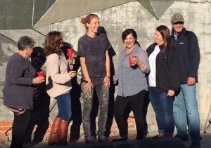 What is a party without food from a nearby cafe and boxes of cheap wine? The mayor stopped by to put his handprint on the project.