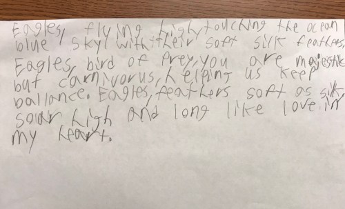 A note about Dawson’s writing: He wrote this on a scratch sheet of paper with words going all across the page, no form. Previously, Dawson’s poems have been silly and rhyming with little sense of poetic language. I held my tongue, knowing that more exposure would lead him, that I did not have to tell him about writing poems. I had to show him. The poetic format was done by me to show him his poem.