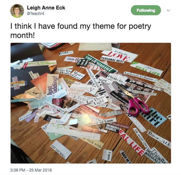 Perusing magazines is part of the fun. Cutting and pasting can be creative, relaxing work. This map captures snippets of March including Slice of Life blogging, our Plein Air guest artists, and Saturday’s march. Some messages are hidden, like the popping out sticky note “South Louisiana.” It’s hiding the title of my forthcoming poetry book. Still working on proofs. Cover reveal coming soon!