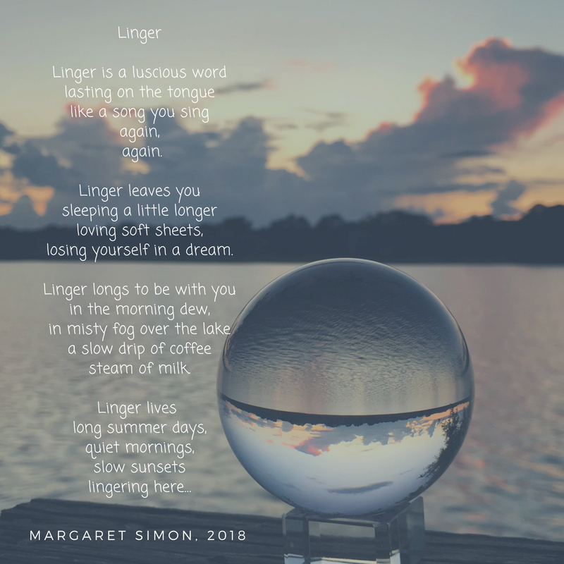 Summer is here! I’ve been enjoying long mornings to walk and swim, pick blueberries, just lingering, not rushing. I remember a Ditty Challenge a while back from Nikki Grimes about writing a wordplay poem. The word linger keeps coming up for me. I paired a wordplay poem with an image I took at the lake in Mississippi where my parents live. A lake is a perfect place to linger.