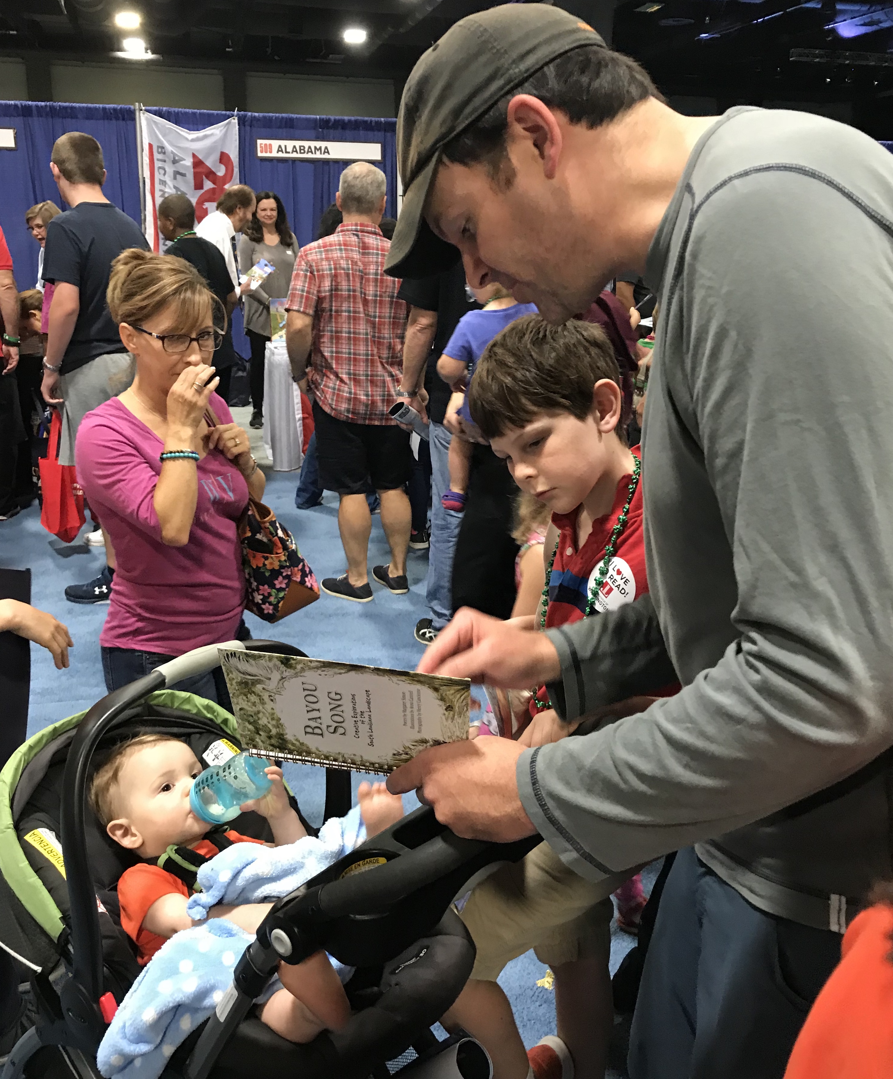 A man picked up Bayou Song and as I reached out to grab it back, I realized he was reading a poem aloud to his infant son while a taller, school-aged boy clung to him. So heartwarming to see this scene in the midst of the crowd.  He explained that he is a stay-at-home dad and he reads poetry to his children every day.