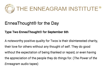 I’ve done some study of the enneagram. It is a system of numbers to define a personality type. I subscribe to a daily email from The Enneagram Institute based on my number, two, the helper. Reading these daily directives, I can see myself more clearly and identify what I need to work on. With reflection, meditation, and prayer, I can be the best of myself every day. I especially like the enneathoughts that give me a little validation, like the one I received for today.