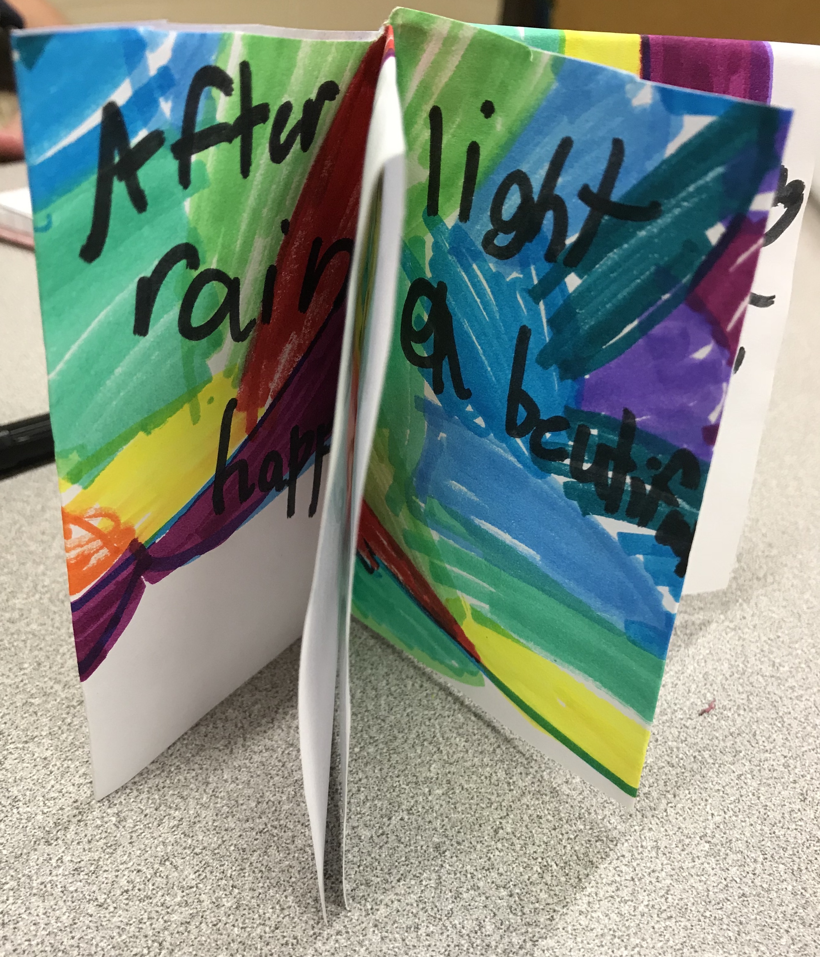 After drawing a dot, I asked my students to collect words and phrases about their artwork to use in a zeno poem. We wrote a zeno together using ideas from the book. Then they wrote their own zeno about their own dot. We folded their art work into a zine and copied their poems into their zine.