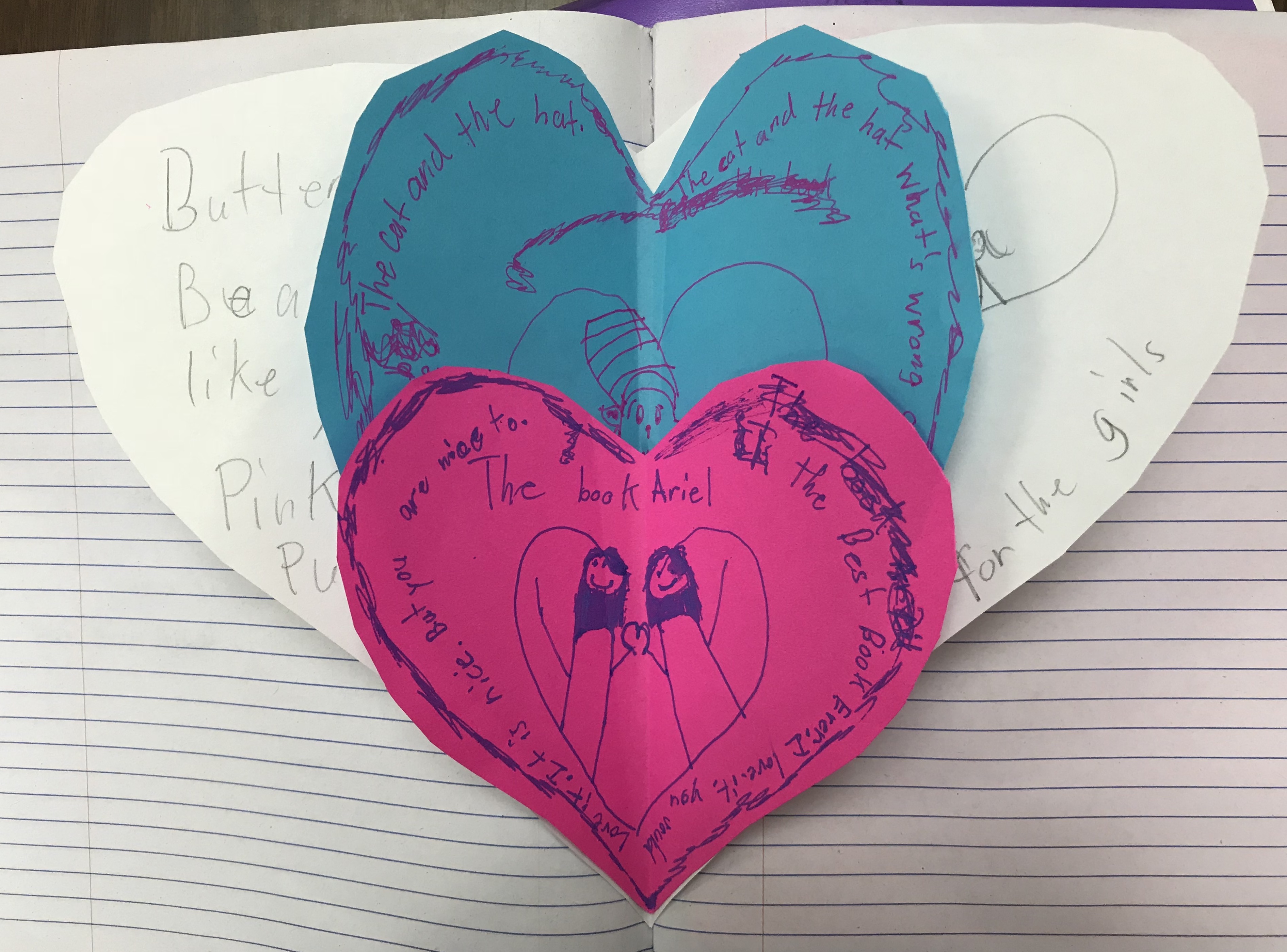 Chloe decided to cut out three hearts. She made one with white paper. Then she asked if she could use colored paper. Then she made a blue one and a pink one. I suggested that she could layer them one on top of the other. She loved that idea. One heart became about her favorite book at home about Ariel. She’s a Dr. Seuss fan and made her blue heart about Dr. Seuss. On the big white heart, she chose herself and wrote one of her poems. Why not choose yourself as your favorite author?