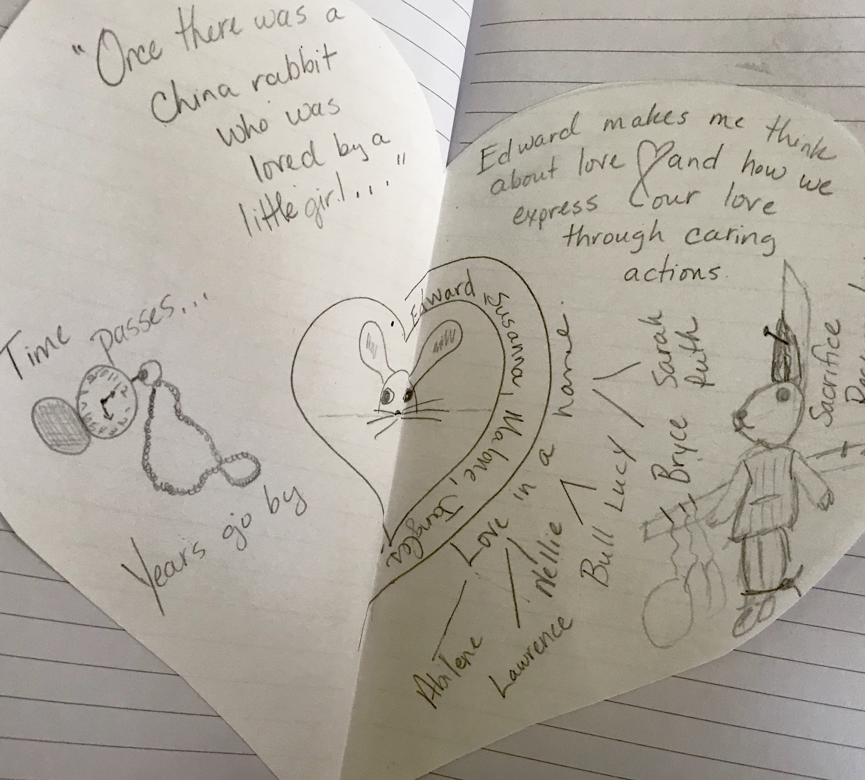 I’ve been reading aloud Kate Dicamillo’s “The Miraculous Journey of Edward Tulane,” so my reader’s heart map became about this book. Edward breaks my heart over and over again.