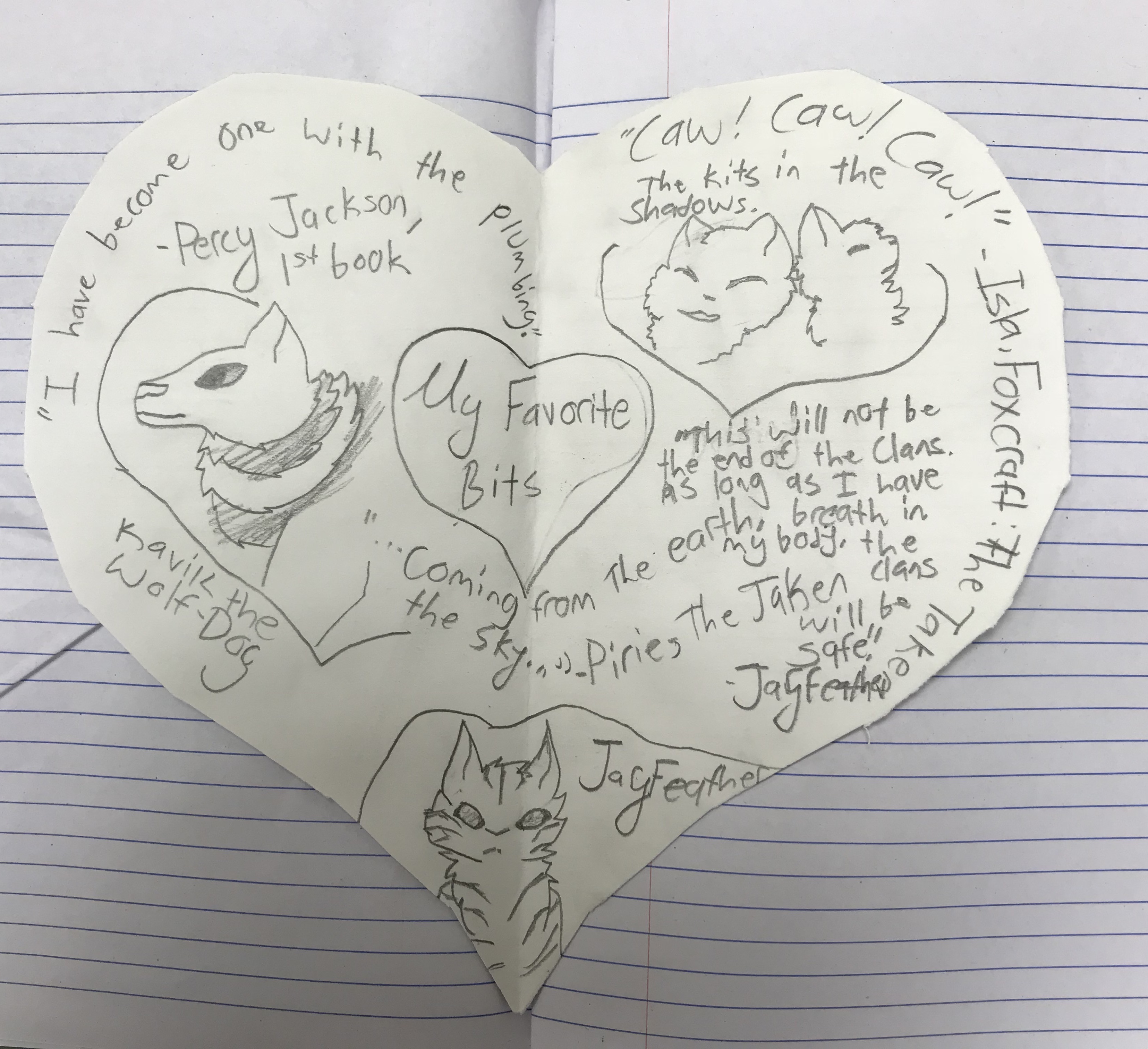 Madison decided to fill her reader’s heart map with quotes from her favorite books. Her all time favorite quote comes from Percy Jackson, “I have become one with the plumbing.” She laughs out loud.