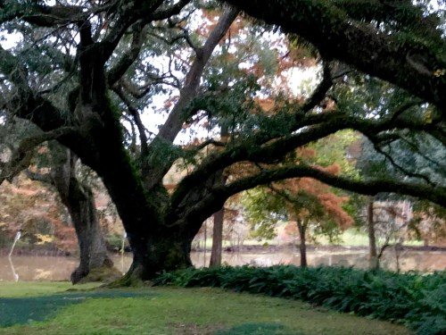 Mary Lee Hahn invited us to join her in a December haiku-a-day project. I’ve started early. When I returned from my morning walk, I took this picture of grandmother oak, but what I noticed was the color of the cypress tree behind her. I don’t usually see this color. Most of the time, the cypress trees quickly shed their needles. I wonder why they are holding on longer this fall.