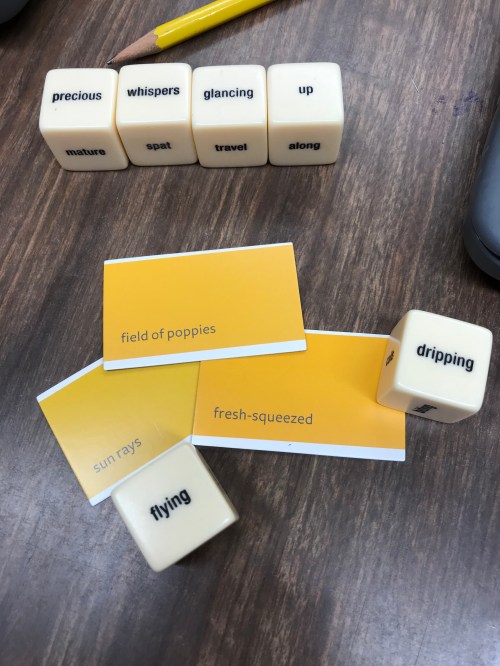 Yesterday she posted a tanka she wrote using paint chips. Tanka is a form that uses a 5,7,5,7,7 syllable count. My students and I took out the paint chips, and I suggested they find three in the same color hue, so their poems would become about that color in some way. Then we tossed around the Haikubes. Karson said, “This is fun!” Music to my poet-teacher ears.