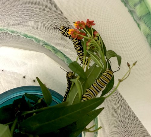 The four made chrysalises on the plastic top of the container, but I’ve had to feed the three that appeared. I’ve been gathering (stealing) milkweed from our church school’s garden to keep them fed. I hope I haven’t brought home even more caterpillars unknowing. So far, so good. I’ll post updates on my Instagram and Facebook pages.