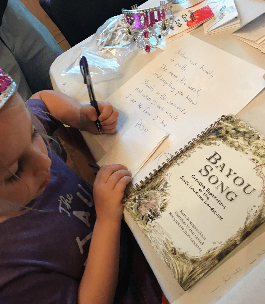 I showed her my book, Bayou Song. “On my book, my name is on the front. It says ‘Poetry by Margaret Simon.'”