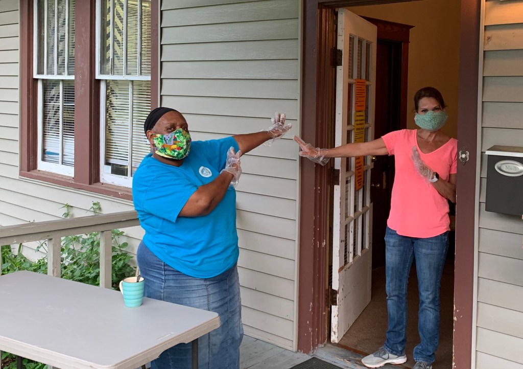 We are still giving out groceries weekly, but the staff and volunteers are wearing masks and gloves. Our clients pull up with their cars or bikes and wait for a volunteer to carry the groceries out and place them on the curb for pick up.