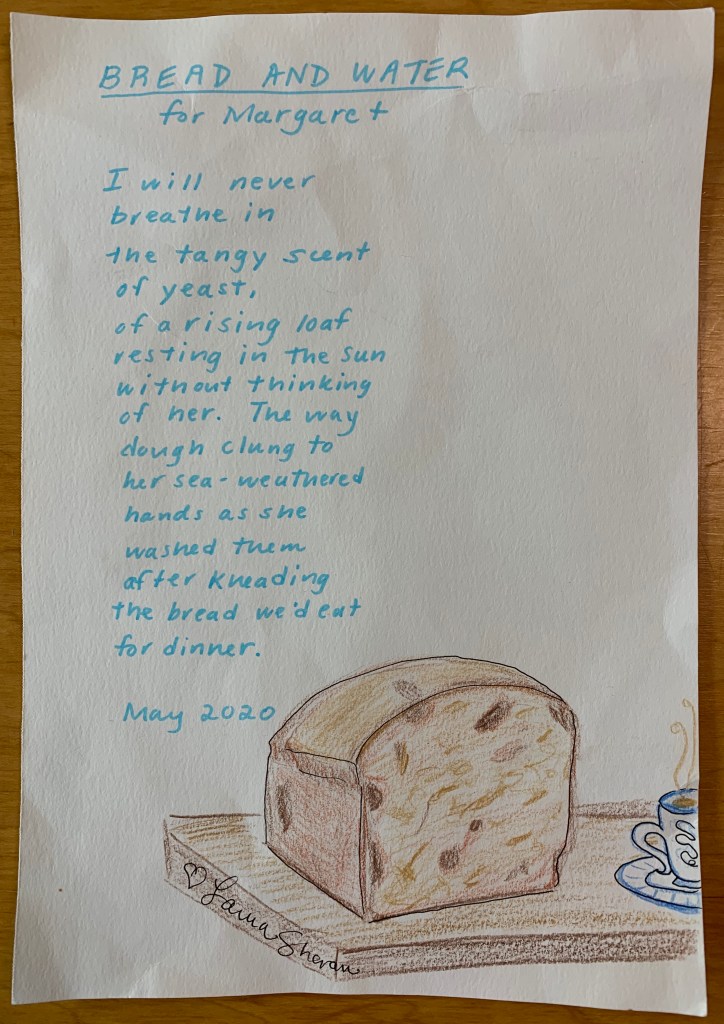 The first poem I received came from Laura Shovan, a dear poet friend and author of The Last Fifth Grade of Emerson Elementary and Takedown. Laura sent sourdough starter, a whimsical pen, and this poem.