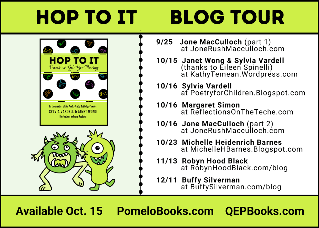 Today I am thrilled to be a stop on the blog tour for Hop To It: Poems to Get You Moving, the latest anthology from the dynamic duo, Sylvia Vardell and Janet Wong of Pomelo Books. The call went out earlier this year for poems that children can experience with their bodies. When the pandemic hit, Sylvia and Janet, who are known for responding to world events with poems, gathered pandemic poetry as well. This book is an inspiration for poets, teachers, and children.