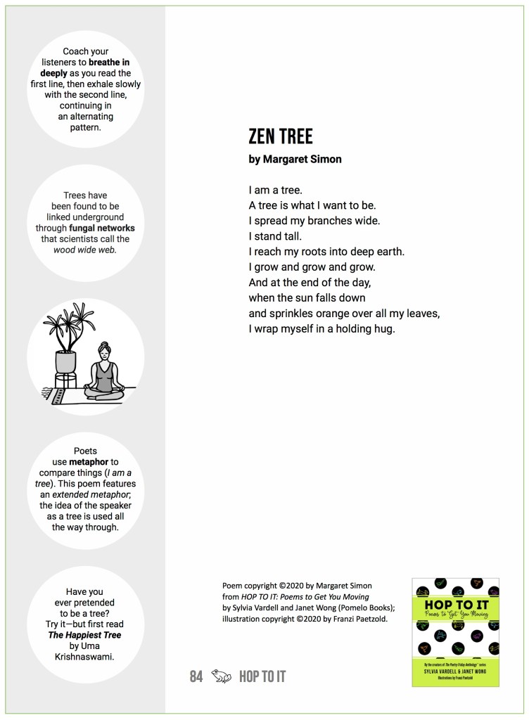 I have written a collection of mindfulness poems that have yet to find a home, so I submitted a few to Sylvia and Janet, who selected Zen Tree. I absolutely love how the side bar bubbles give more information as well as a paired poem. This added touch is what makes Pomelo Books unique and teacher-friendly.