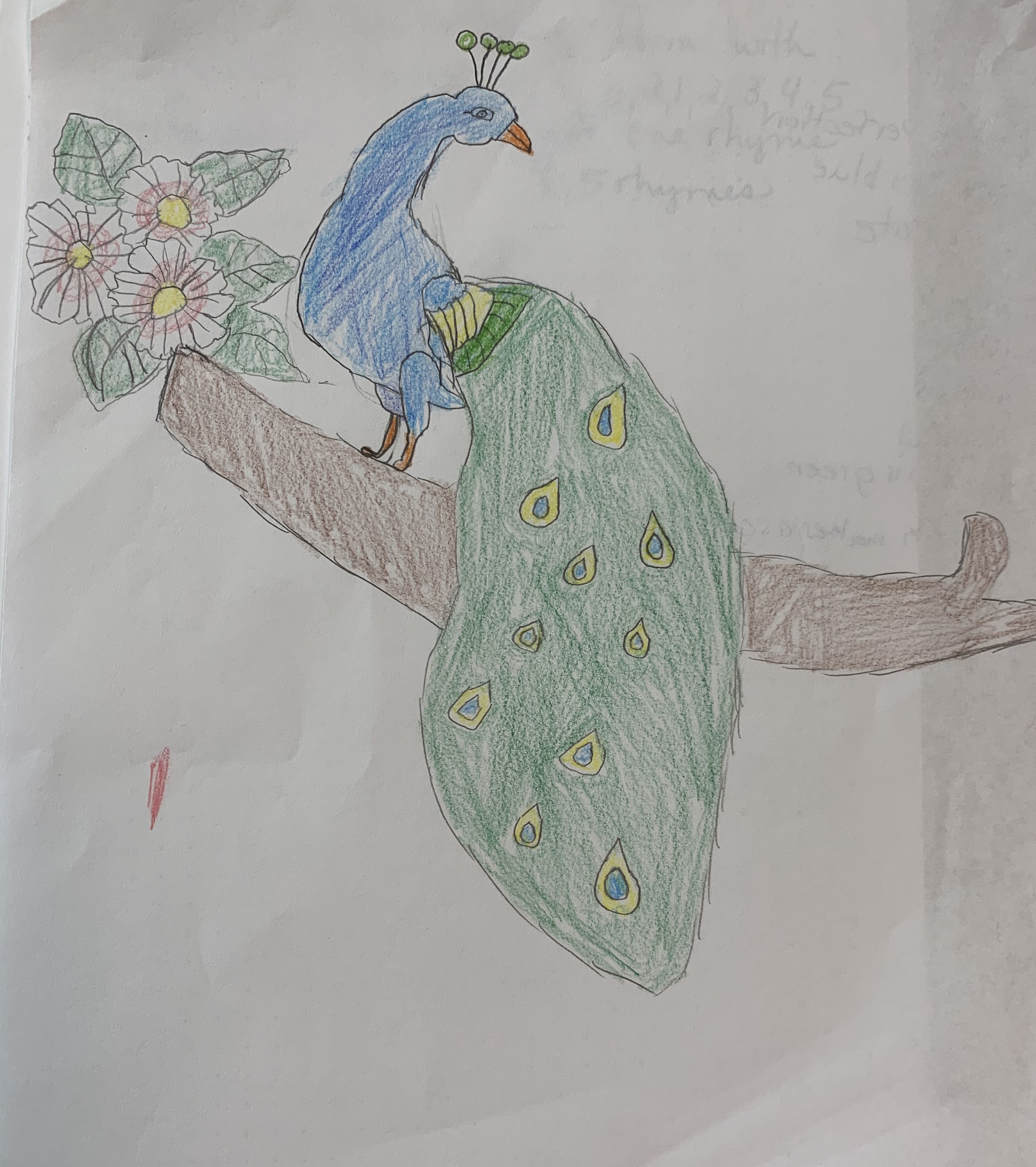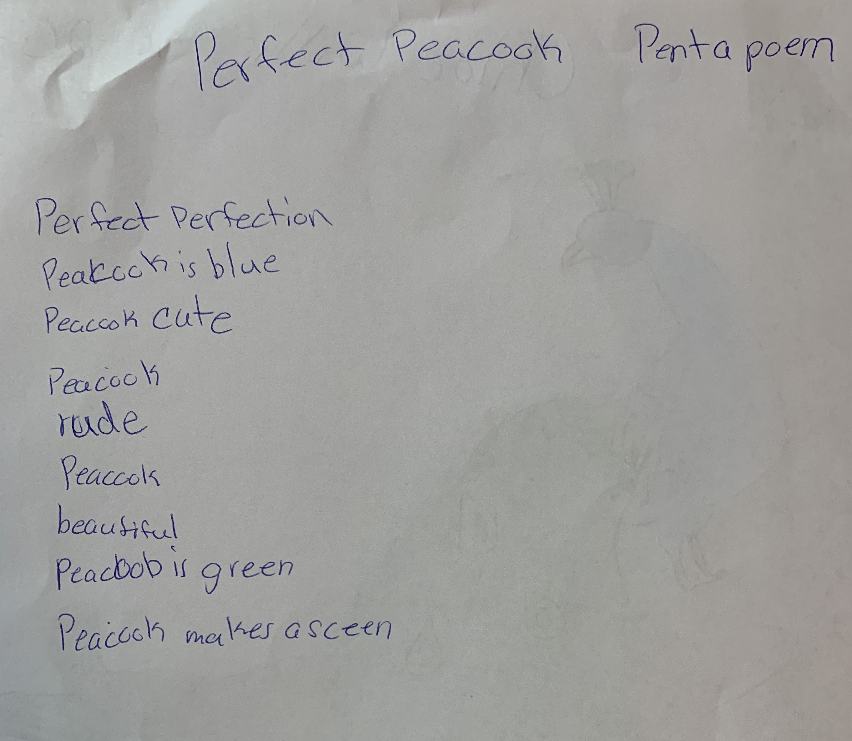 I enjoy playing with a new form, and this week I had a few to try out. One was invented by my very own student Chloe. This has happened only a few times in my teaching career when students become so comfortable with poetry that they venture into creating a new form. Chloe was writing to a prompt from Write Out, a collaboration between the National Writing Project and the National Park Service. The prompt asked students to draw a bird and write a journal entry for a day in the city. Chloe decided to draw a peacock. Then she wrote a very P heavy peacock poem. The aha came when she realized there was a distinct rhythm to her words. Voila! A new form!