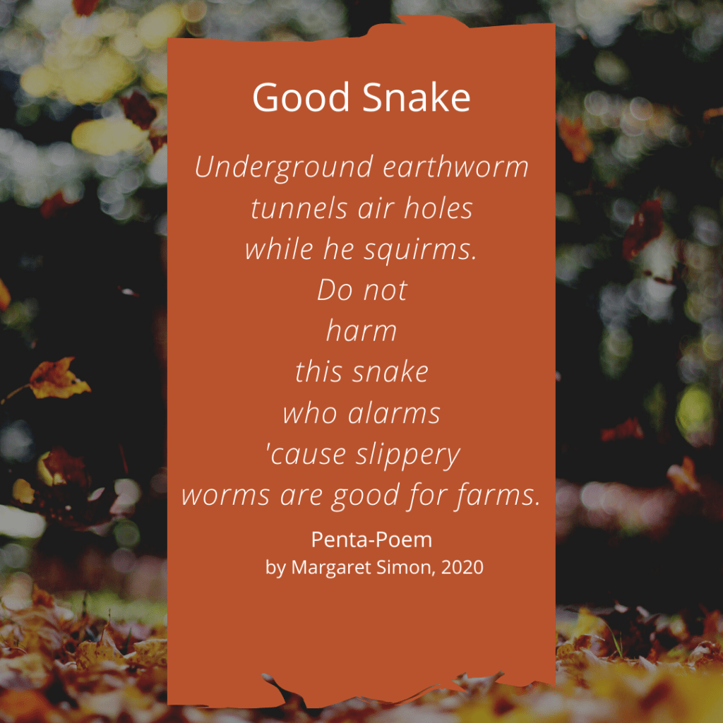 Her form uses the syllable count of 5, 4, 3, 2, 1, 2, 3, 4, 5. We talked about the number five and decided that Penta-poem (more P words) had a nice ring to it. There is an optional rhyme scheme.