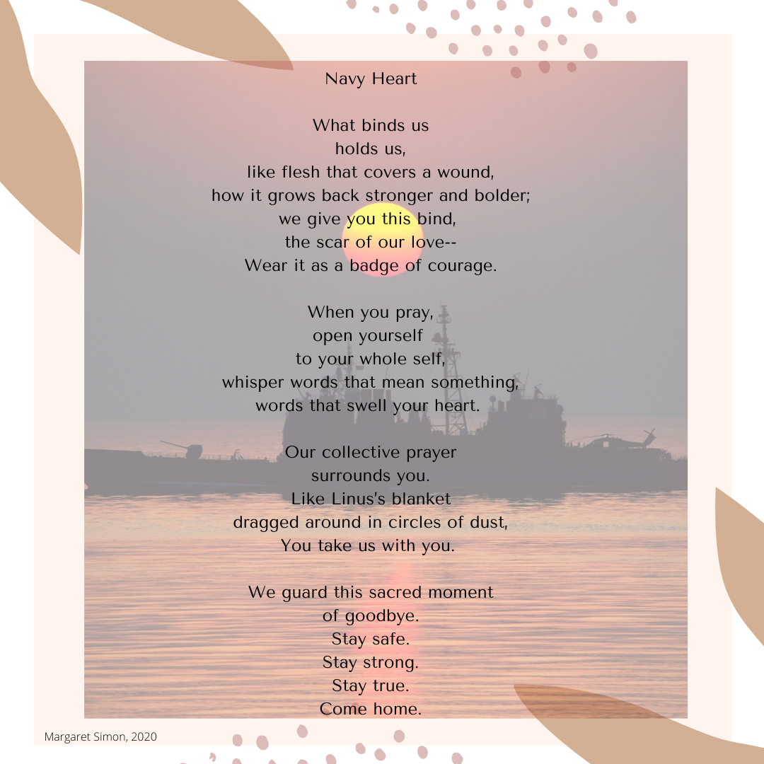 It’s not every day that I am commissioned to write a poem. Well, actually, it’s never happened. The secretary at our school has a grand nephew, her godchild, going off to the Navy this month. She asked me to write a poem for him.