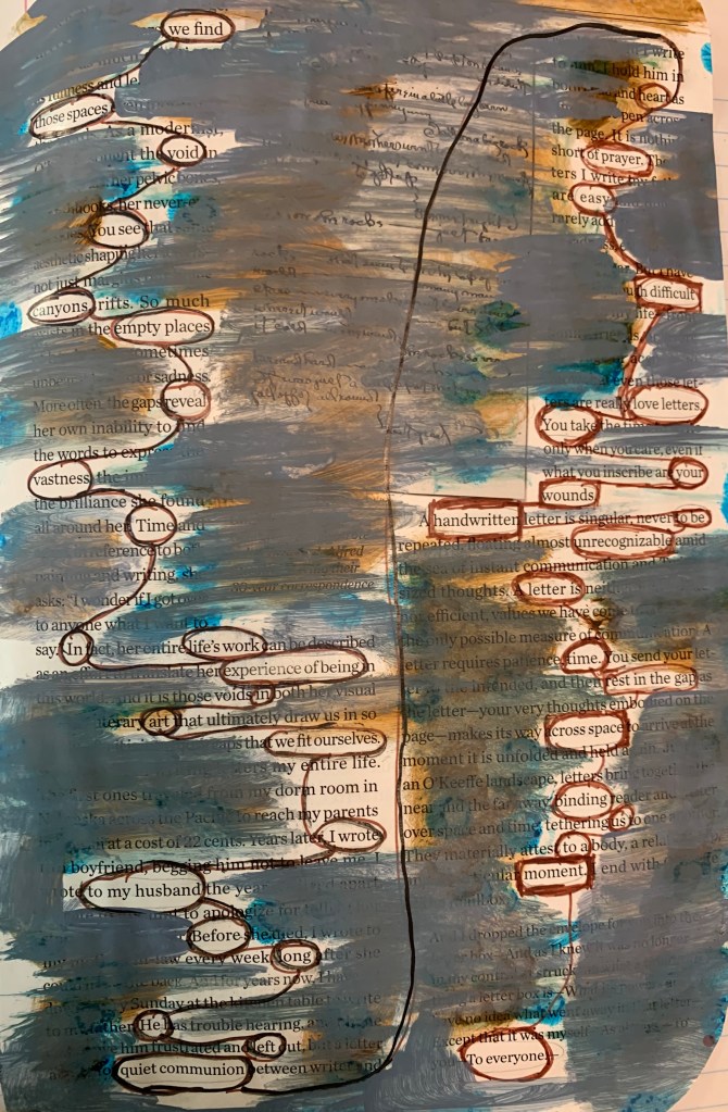 I was fascinated by the article in The American Scholar by Jennifer Sinor, “Every Letter is a Love Letter.” She wrote of how Georgia O’Keefe wrote letters for years to her husband. The thing that drew me in was the language, the words in the article expressing the space that letters provide. There is the space of time between the writing and the receiving. In this day when a message can be sent before you even check the spelling, words can fly across vast spaces in a millisecond. I wanted to capture this idea somehow, so I thought of using erasure poetry.