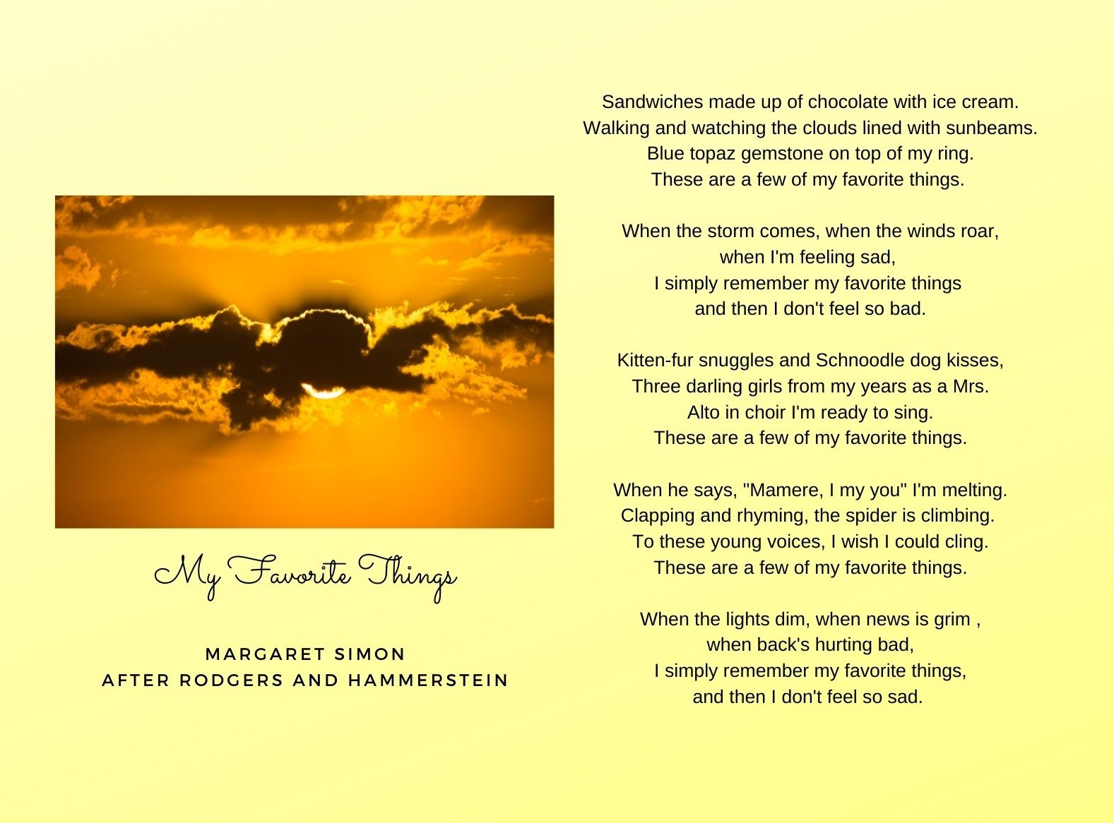 Laura Purdie Salas has been a writing mentor in my classroom for years now. Her books and poetry speak to children ( and to this adult). A few weeks ago she posted this poem on her blog. I used it with my students for a beginning-of-the-school-year writing prompt. I did not require the precise rhyme and rhythm pattern; they got the gist of making a list of favorite things.