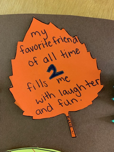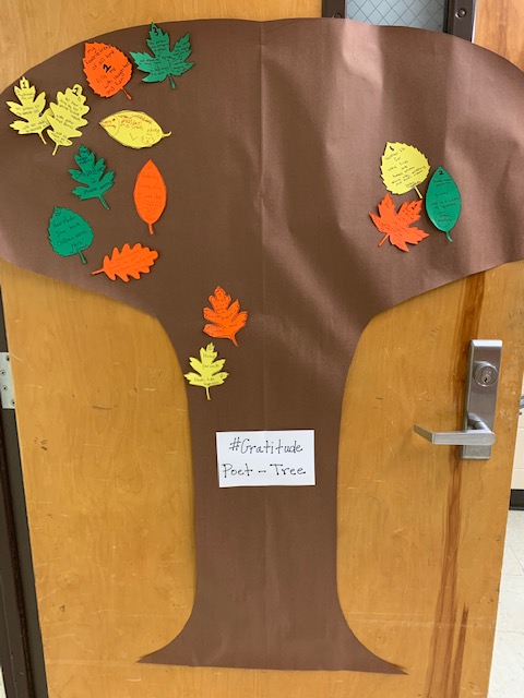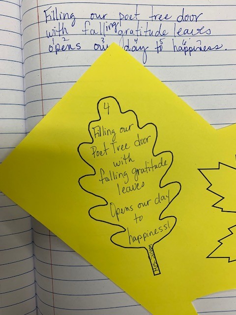 On Monday, I decided to start a monthlong project of gratitude poems with my students. When they walk in and open their notebooks, I ask, “What are you grateful for today? What is making you happy right now?” We have a quick discussion and then write small poems. I’ve printed leaves on colored paper. We write our #gratitude on a leaf, cut it out, and add it to the “Poet-Tree” on the classroom door.