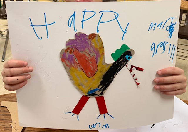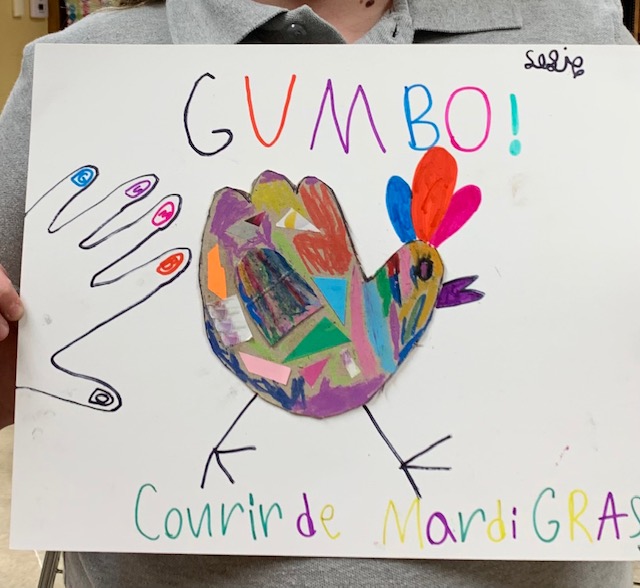 I introduced this cultural tradition to my students, and we did chicken art on the Thursday before our Mardi Gras break. We followed a video created by the Acadiana Center for the Arts linked here. The chickens were created using recycled materials. In Courir de Mardi Gras, the costumes are made with scraps of fabric and masks are made with screen. It is the total opposite of New Orleans Mardi Gras which is all about royalty and elaborate beautiful costumes. Courir de Mardi Gras has a captain rather than a king who leads the krewe.