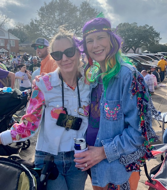 My husband and I became interested in Courir from a performance we saw at the  Acadiana Center for the Arts. We decided to go to the parade in Eunice when all the krewes come in, some on horse back. My daughter, son-in-law, and grandkids joined us. We had made some costumes by adding fabric patches and fringe to old clothes. I used an old scarf, some sparkling jewel tape, and an old denim shirt. As the parade came through, Leo was poked (in jest) by a couple tricksters; one of them untied my shoelaces. Afterward there was a band we love to hear and dance to, Steve Riley and the Mamou Playboys.