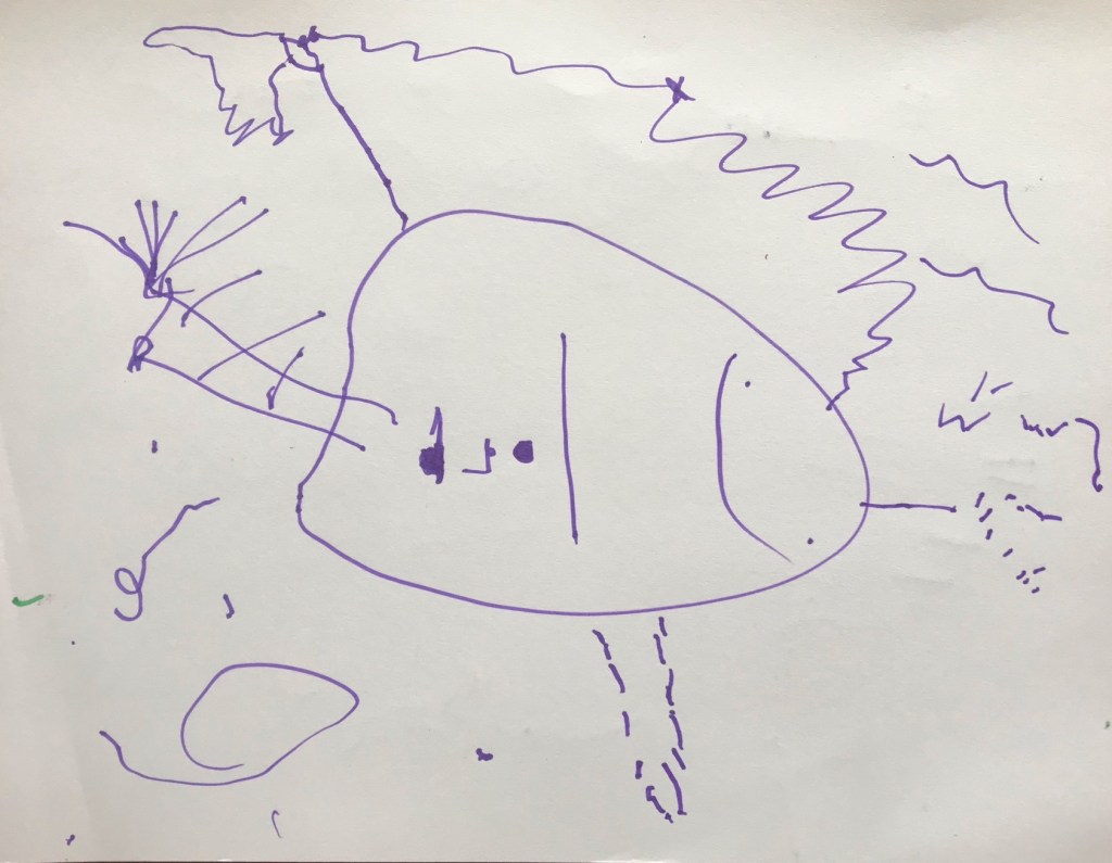 Now that Leo is four, he is able to speak what his imagination tells him he has drawn. Yesterday after his first soccer game of the season where he spent most of the time on the sidelines eating Goldfish, I took the opportunity to interview him as he was drawing. To me, his grandmother, this is priceless. You will hear his younger sister, Stella in the background. She is saying “I want to sit on you, Mamere.”