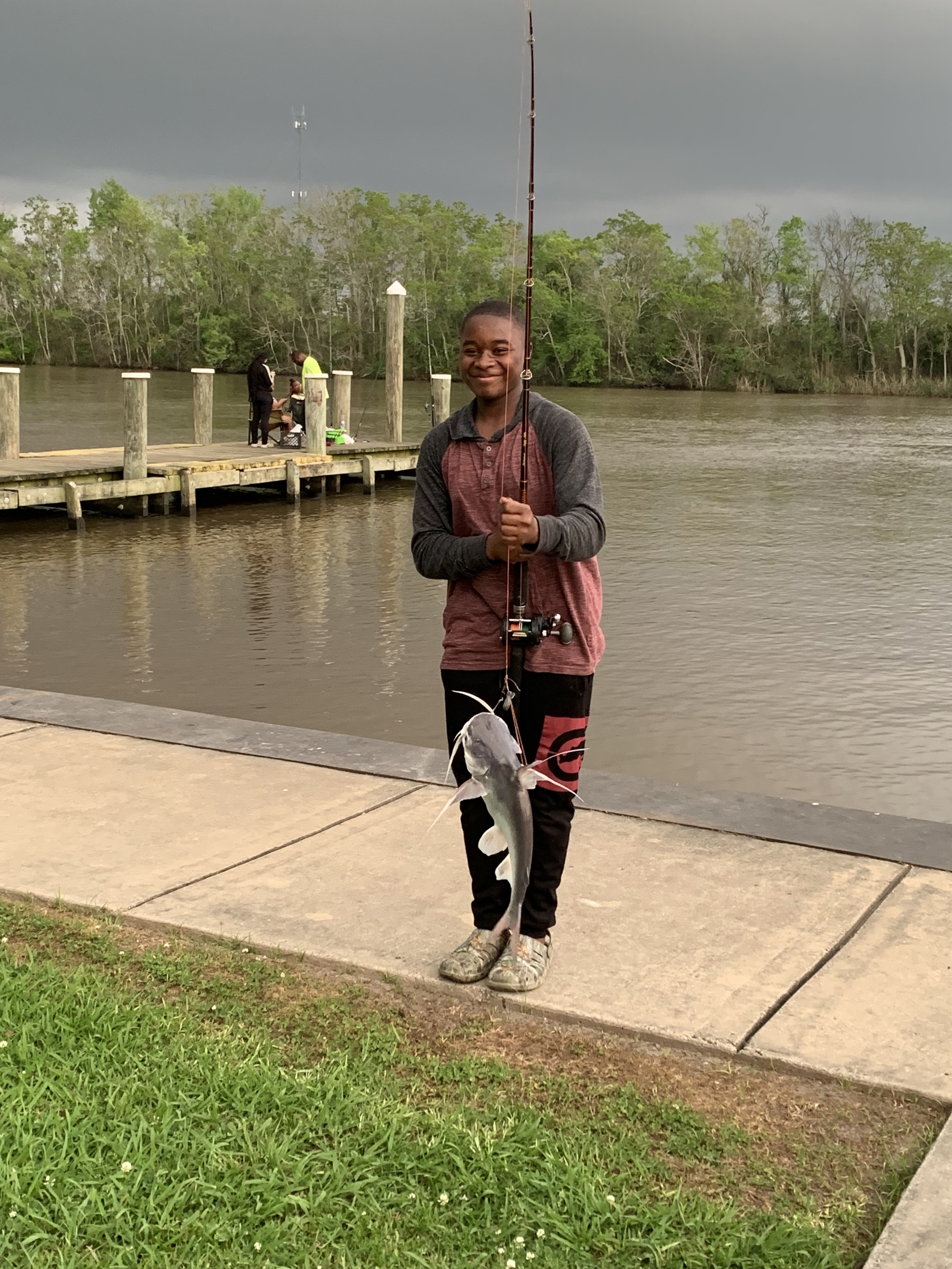 Today I want to introduce you to Markavian. I don’t know him, and I’m not sure that’s how to spell his name, but when I took his picture, he proudly told me what his name was. He was beaming from having caught a huge catfish right off the dock. I asked permission to take his picture. There is so much that I love about this picture. His smile. The largest catfish I’ve ever seen. And how it captures the attitude of a fisherman. My husband says that our newspaper’s sports section is usually just men holding fish. It’s true fishing is a big time sport around here. Perhaps Markavian was competing with his brothers. There seemed to be a family in the background, and I caught him just as he was about to go show off his catch of the day.