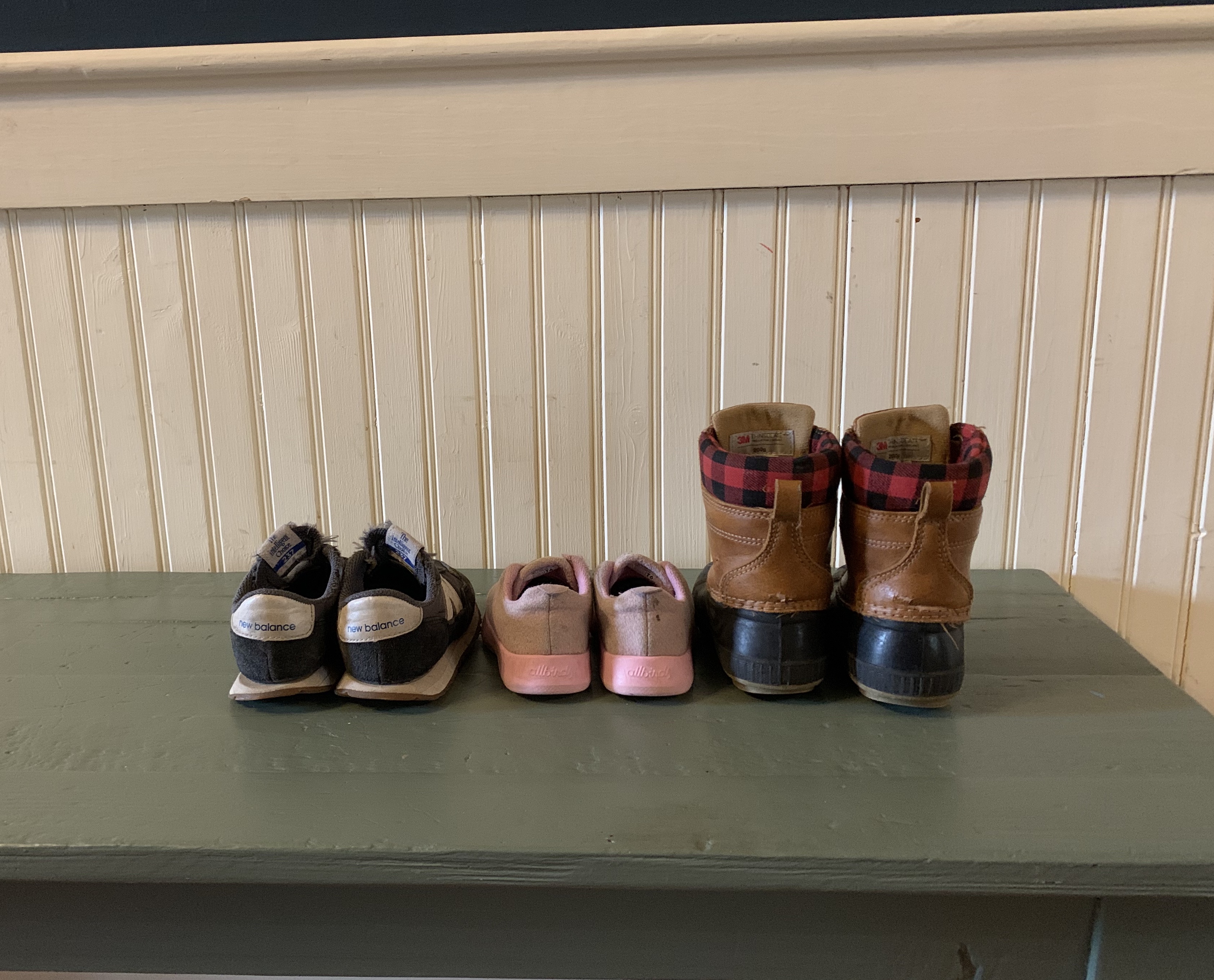 Today’s photo is one I took at my daughter’s house last weekend. I had returned her two children from a morning at the museum and was getting ready to leave when I saw the shoes posing. Perhaps my daughter had placed them there, but more likely it was Stella who, at the age of two, likes a certain order to things. Her mother was like that, sorting all the cans in the cabinet by size and color at a very young age. She gets that from her father, and her father gets it from his mother. I once took a personality test that labeled me “abstract random” and my husband as “concrete sequential.”
