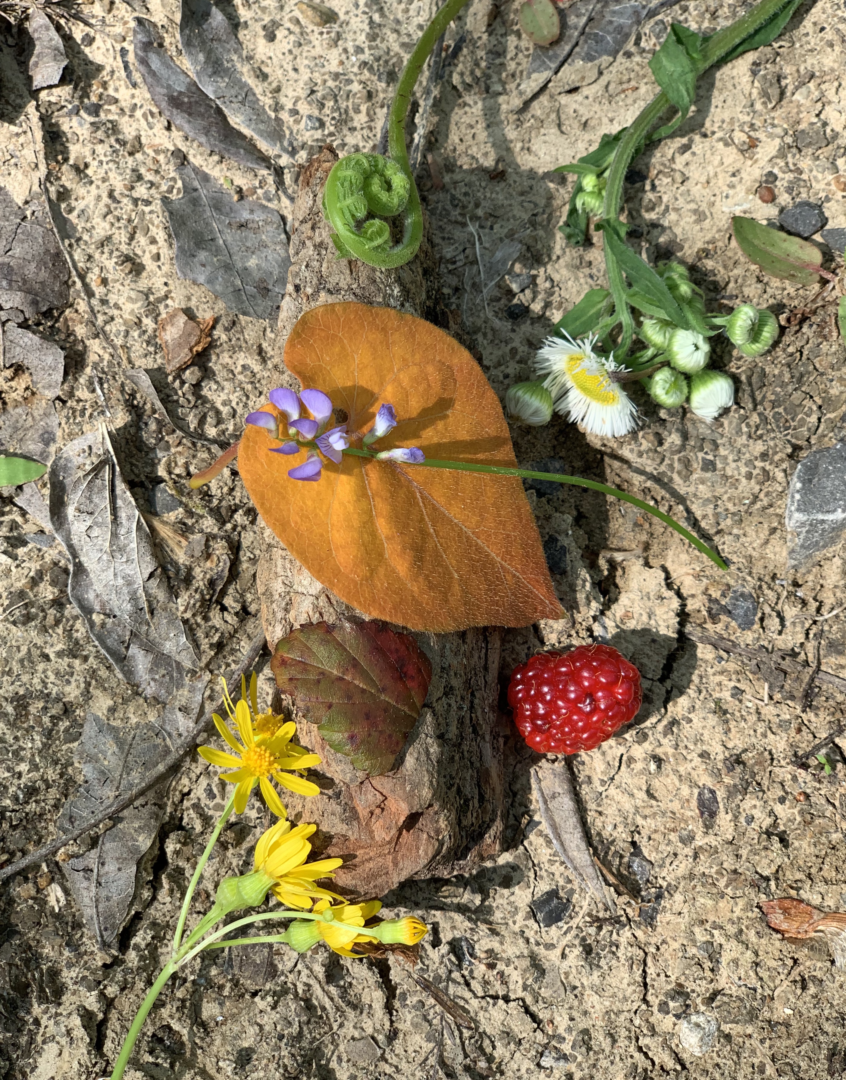 On a recent yoga Women’s Wellness Retreat, I collected things as I walked a forest trail. The instructor suggested collecting a rainbow. My collection includes an unripe blackberry, a piece of dead wood, a fiddlehead fern, a few wildflowers and leaves. When we stopped for a short break, I arranged them into something that pleased me and took this photo. I left most of it in the forest where I found it. I kept the heart-shaped leaf, fern fiddlehead, and the purple wildflower to press and tape into my notebook. We poets are pretty good at assigning symbolism to things. If this collage arrangement speaks to you in some way, write a small poem in the comments. Be sure to support other writers with comments as well.