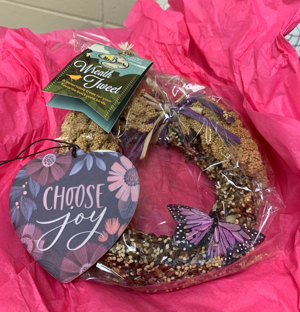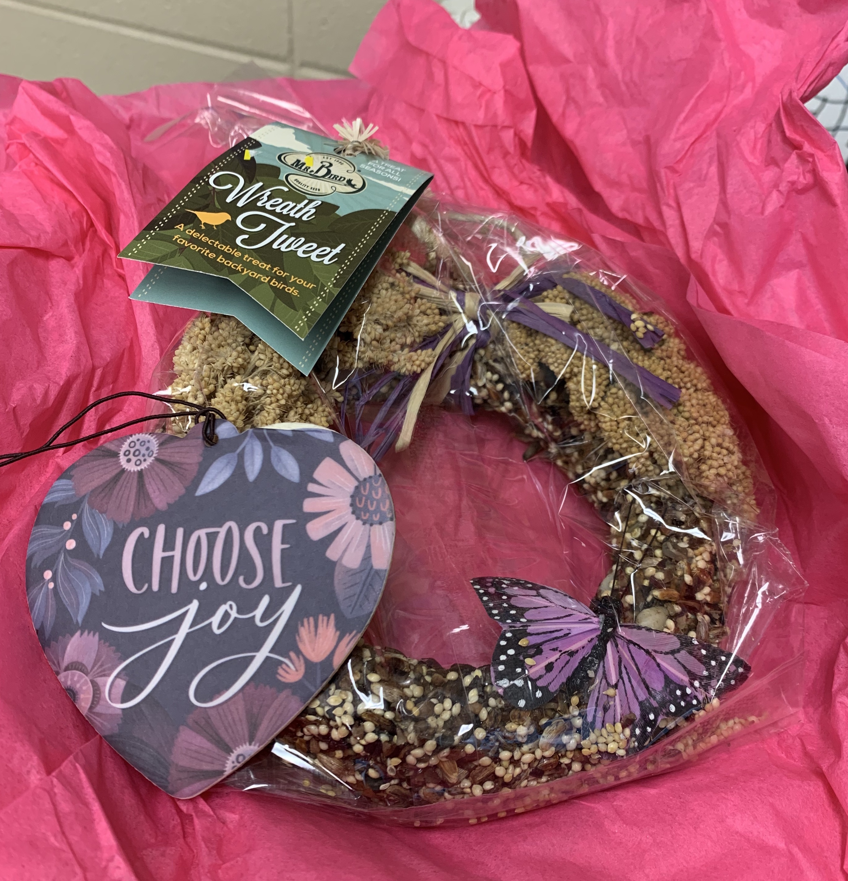 Not only was the thought of a nonbirthday-birthday fun for me, the gift was just right, a bird seed wreath to hang near a window to watch the birds come to eat. Thoughtful, kind, and all about me!