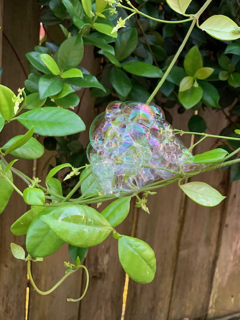 For Easter I brought my three-year-old grandson a dinosaur bubble blower. He went outside to blow the bubbles. I’m not sure how he figured out how to make bubbles pile up on each other. He was first doing this on the ground. Then he made this beauty on a vine. It looks like a flower of bubbles.