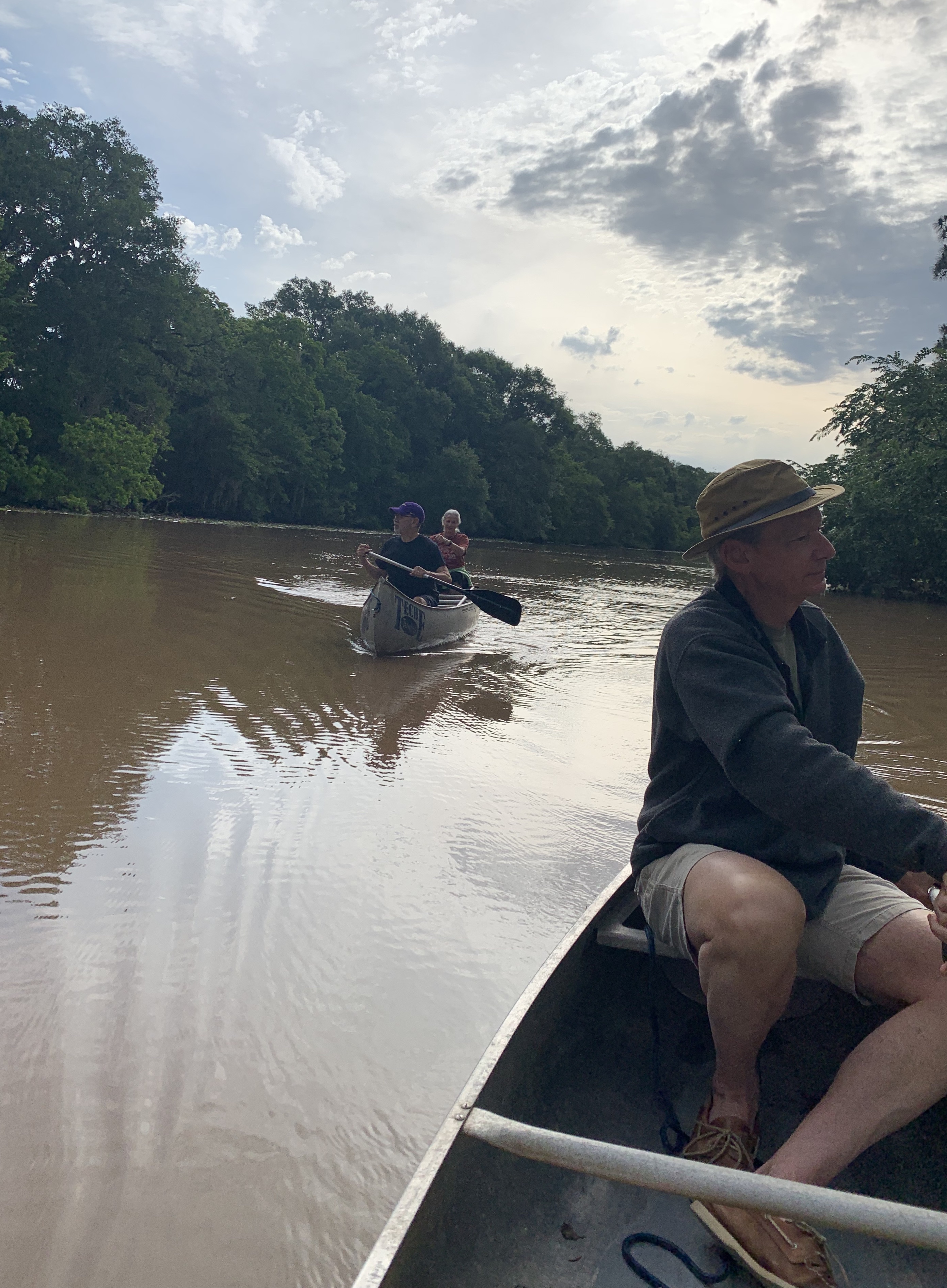 On Sunday morning we paddled on Mother Earth’s church, the Bayou Teche. The day was near perfect with a little cloud cover and moderate temperatures. We invited friends to join us. We actually saw an alligator. He was a juvenile about 3 feet long sunning himself on some concrete rip-rap. I got a good picture of him. He was totally still, not spooked at all by our moving closer to him. He smiled for me.