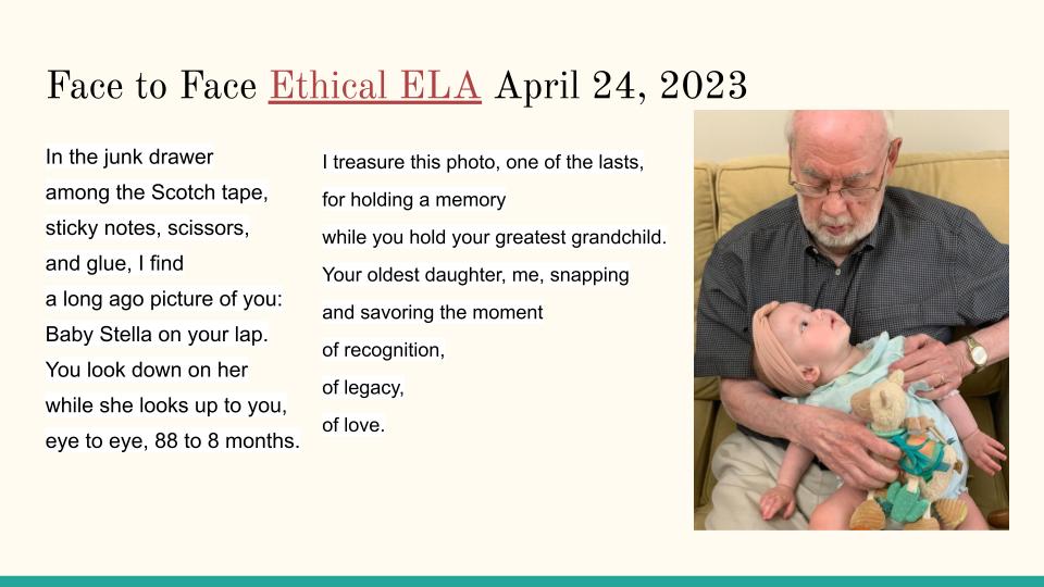 I am saving my poems in a Google slide show which allows me to save each slide as an image and share it here. Above is a photo of my father and my granddaughter Stella in the summer of 2021.