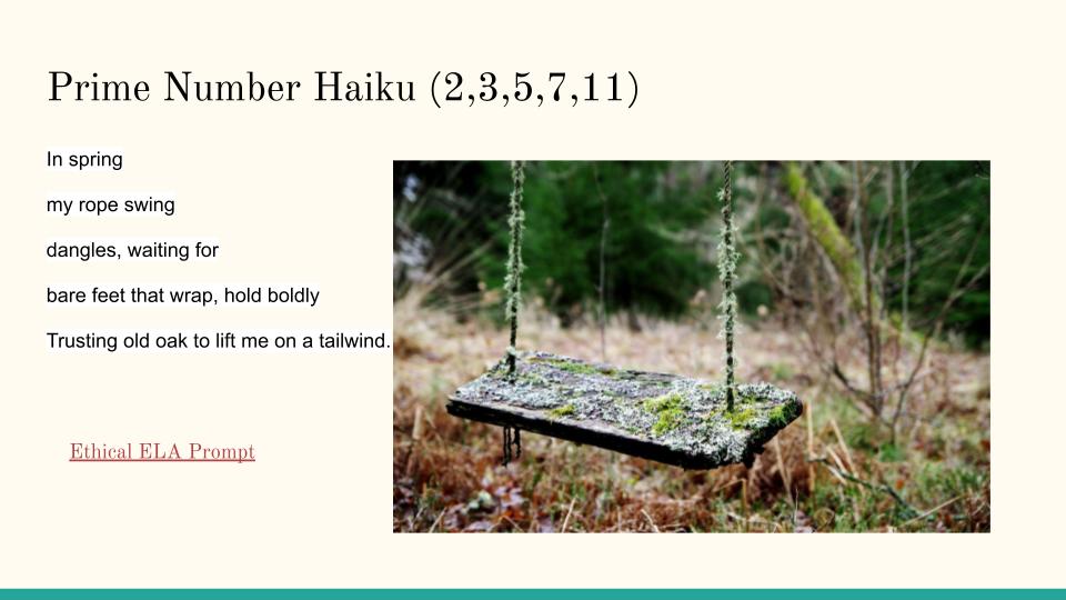 I am keeping all of my daily poems in a slide show. Here’s my own Prime Number Haiku which was a prompt from Ethical ELA.