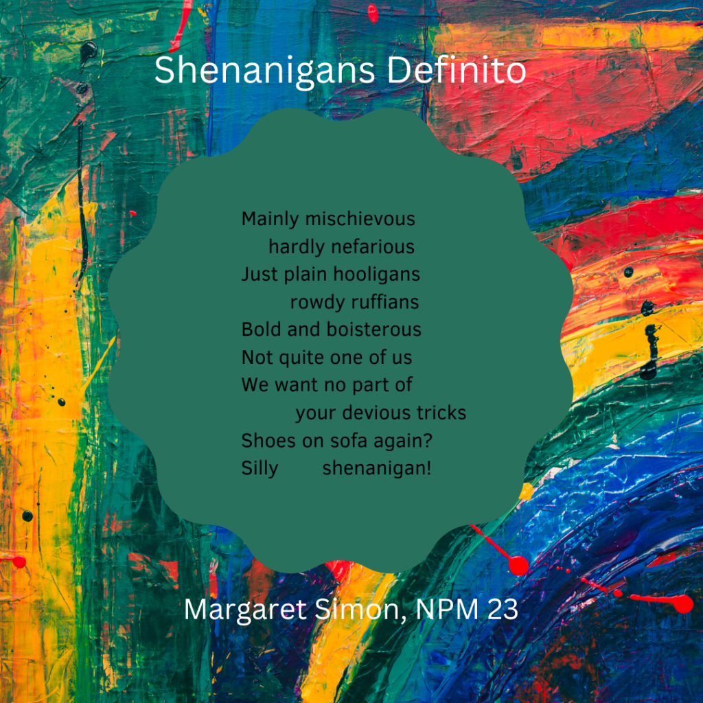 One of my favorite forms for playing around with words is Heidi Mordhorst’s Definito. What a clever form! It’s a poem for children of 8-12 lines that uses word play to define a word. I had a draft started about the word Shenanigans. Isn’t that a fun word to say? After spending a night with grandson #2, I was taken back to it.
